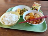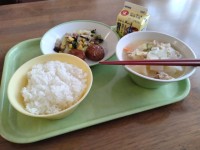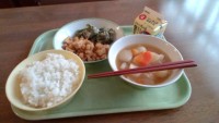【本日の献立】 ふくらぎのえごまだれ いり大豆和え 豚汁 RICE MILK
