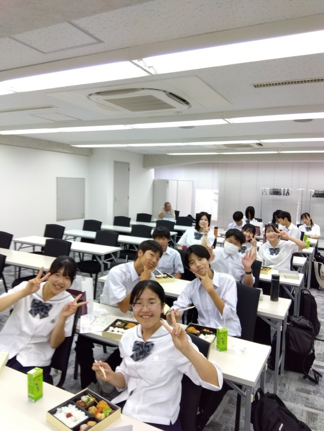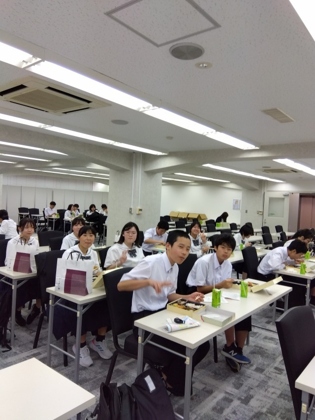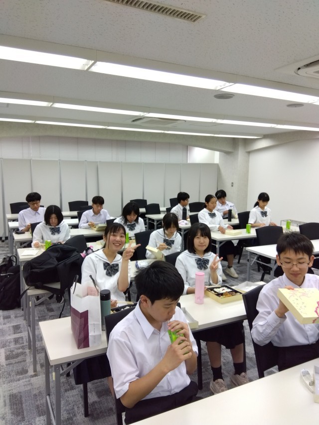 和菓子作り体験を終えた班のメンバーたちのランチタイムです。