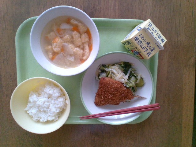 【本日の献立】 あじフライ 海藻salad みそsoup Rice Milk