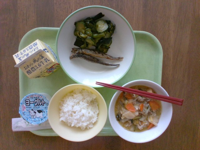 【本日の献立】 ししゃもの米粉揚げ わかめの中華和え 厚揚げのみぞ炒め yogurt milk rice