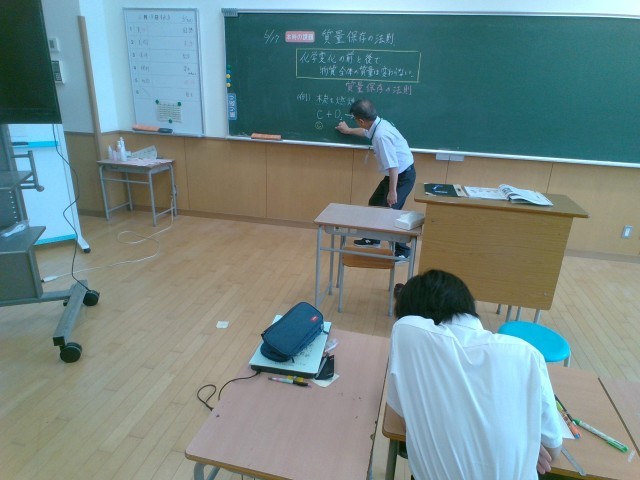 さくら3組(左)は理科。質量保存の法則について、確認しています。先生と生徒のやり取りにより、学習が進んでいく素敵な光景。