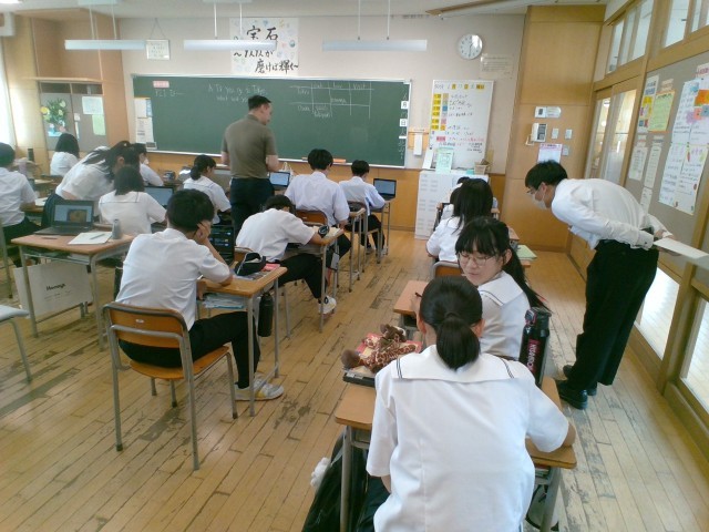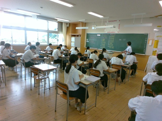 2年3組(右)は英語。If you go to Tokyo, what will you do? と聞かれても東京について知らないと答えづらいので情報収集中。もんじゃ焼きを見ている人がいました。