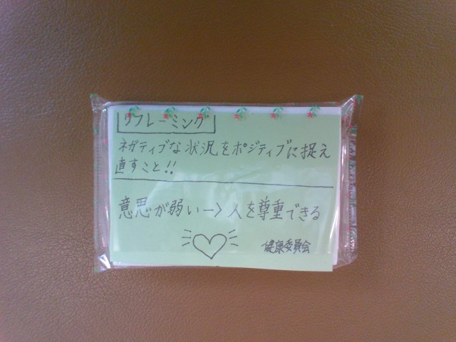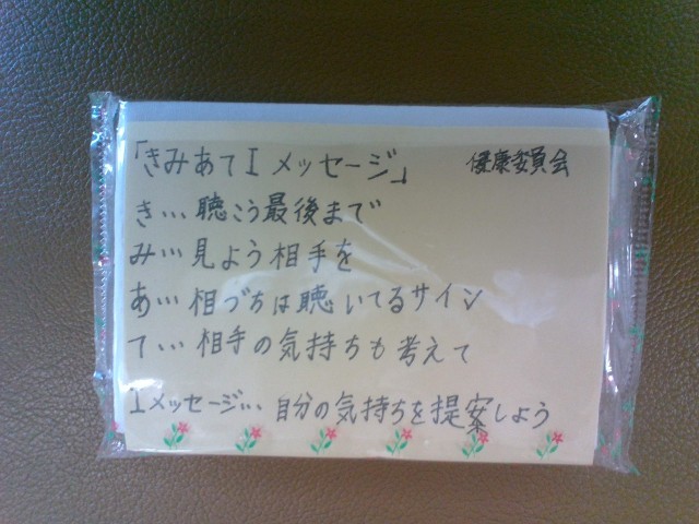生徒玄関では、健康委員会がティッシュ配りをしていました。ティッシュには、昨日のアサーション集会での学んだことを書き入れたカードが入っています。日常生活で実践してみましょう。