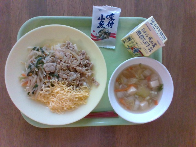 【本日の献立】 ビビンバ 中華スープ 味付け小魚 ごはん 牛乳