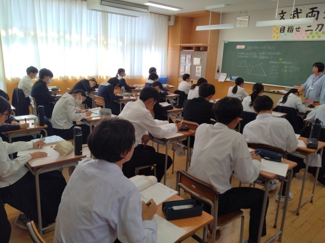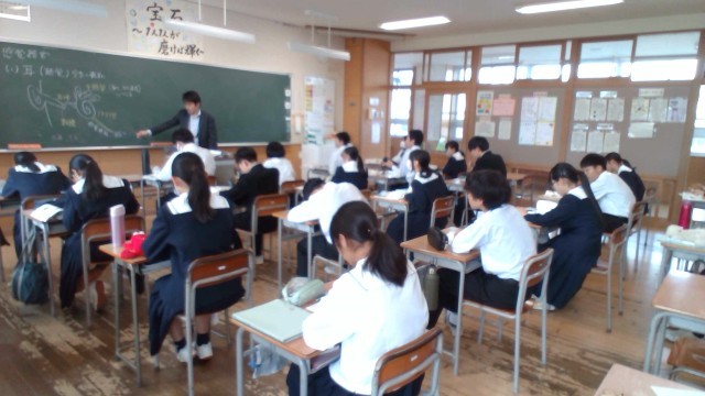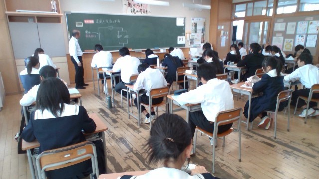 いよいよ来週は第2学期期末考査。3年生にとっては、大事な大事なテストです。どのような様子で授業に臨んでいるのか、2時間目におじゃましました(写真は右から1、2、3組)。