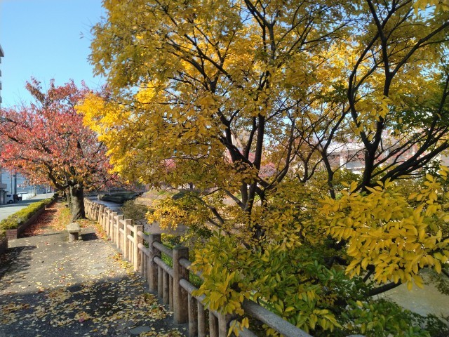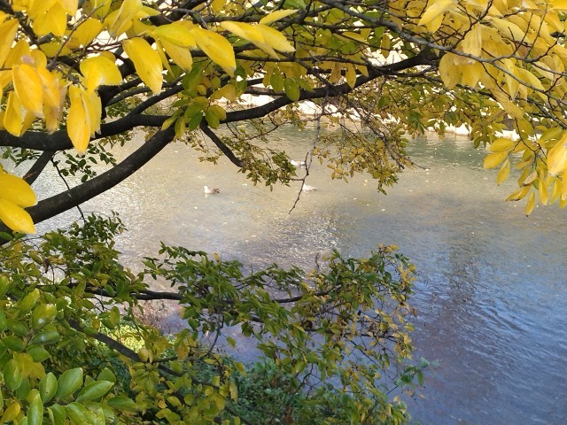 車をおいて会場までの徒歩すがら、川沿いの紅葉&黄葉が美しくて思わず撮影。あと、川面に可愛らしい鴨がいて、これまた撮ってしまいました(2枚目の写真、3羽見えますか?)