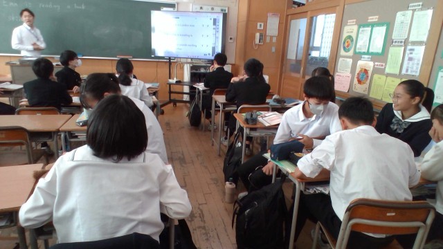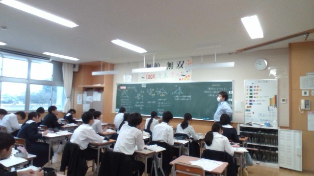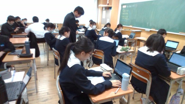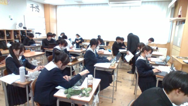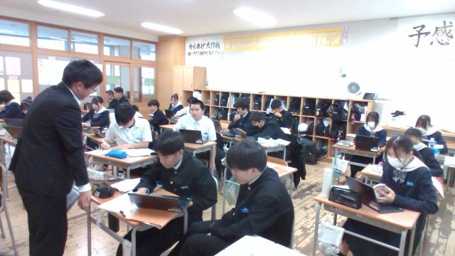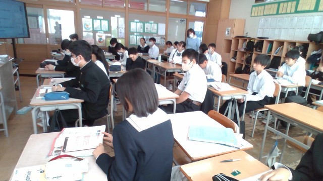 3組は英語。テーマ作文(あなたの「推し」は?等)に取り組み中。テキトーに決めたものではなく、本当に自分のおススメを題材にすることが大事。そうでないと、書く内容が頭に浮かばない。担当先生の「推し」が何かも分かった時間となりました。