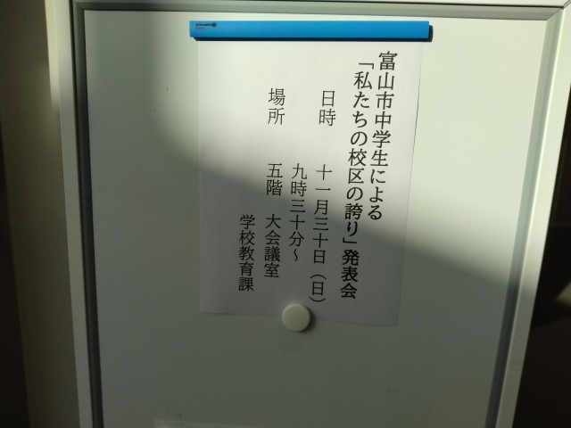 本市初開催(のはず)の「富山市中学生による『私たちの校区の誇り』発表会」が、市教委の入っているビル内で行われました。城山中からは2年生女子2名が参加。プレゼンテーション発表(英語で)、ポスターセッション発表各々5校で、本校はプレゼンテーションの方でした。