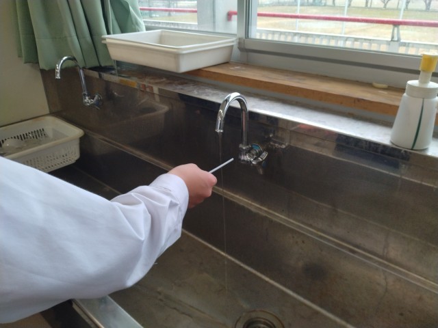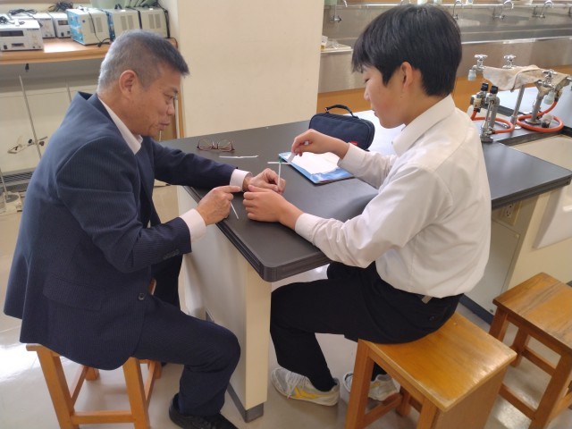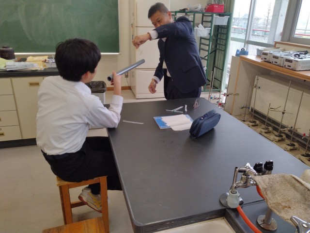 静電気に係る実験中です。竹とんぼのようにしたストローがくるくる回ったり、蛇口から細く垂らした水が曲がったりする様子を確認することができました。先生、生徒共に楽しそうに取り組んでいることが何よりです。