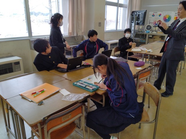 2組は国語。訪問した時は、式子内親王の著名な歌「玉の緒よ・・・」について、教師と生徒とのやり取りが行われていました。新古今和歌集に優美で絵画的な歌を沢山残しているので、ぜひ他の歌も味わってもらいたいところ。