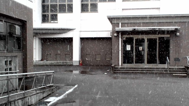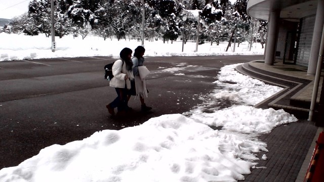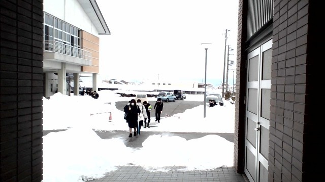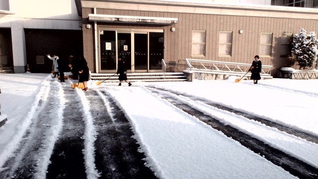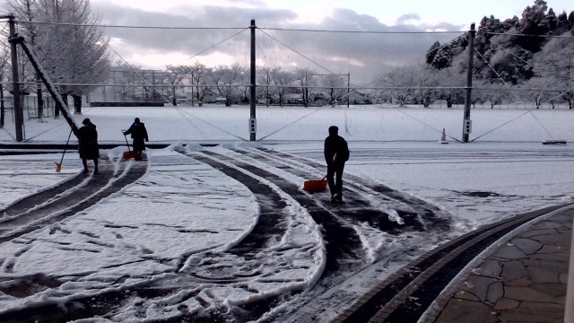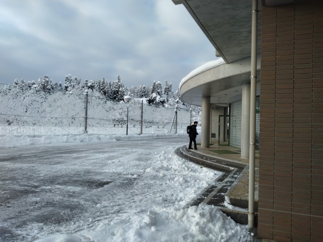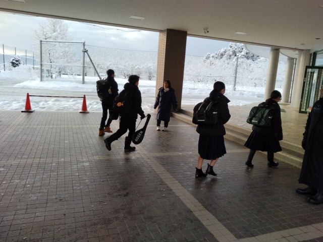 20cm程の積雪のある朝となりました。1年1組の生徒と担任が除雪を行いました。