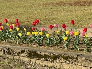 本日、小雨が降り続く一日となりましたが、部室側の桜が咲きだしています。また、校舎周辺の草花も開花を待つばかりです。