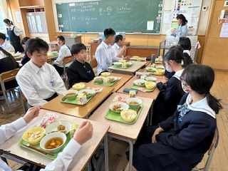 今日は1年生が入学した「お祝い給食」です。1年生は嬉しそうに給食を食べ始めました。美味しい給食を作ってくださる調理のみなさんに感謝しながら、たくさん食べて、元気に成長してほしいと思います。