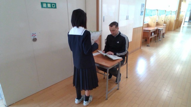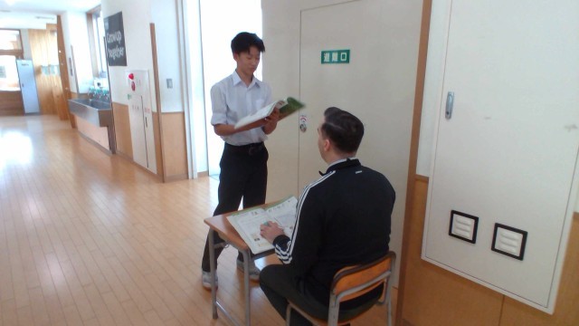 1組の5限目は英語です。廊下でスピーキングテストを行っていました。
