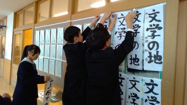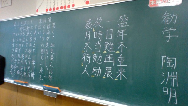 学級担任のメッセージに迎えられた生徒たち。「まさに勉励すべし。歳月は人を待たず。」