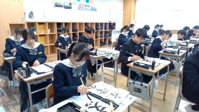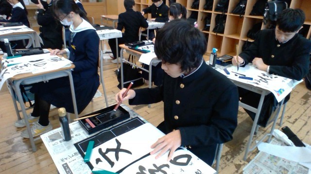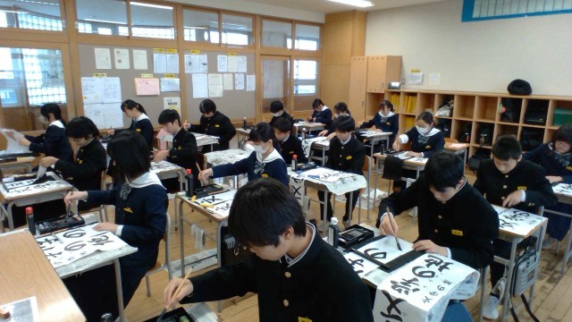 始業式後の書初大会では、静寂な雰囲気の中、お手本をよく見て真剣に揮毫しました。