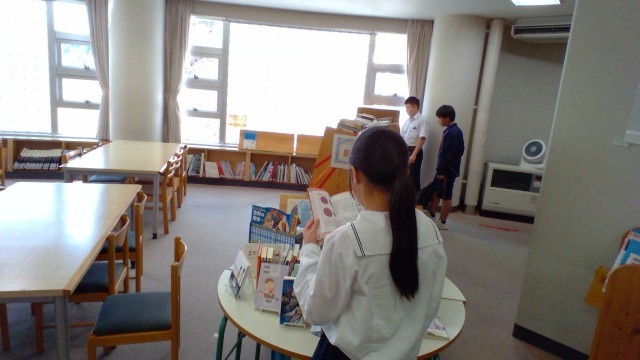 給食をお腹いっぱい食べた後、図書室で有意義な時間を過ごしています。本を読んでいる人、友達と読み合っている人、自習している人もいます。