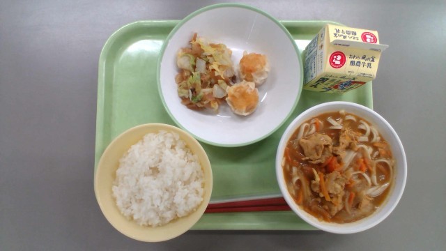 【本日の献立】にんじんシューマイ 福神和え カレーうどん RICE MILK