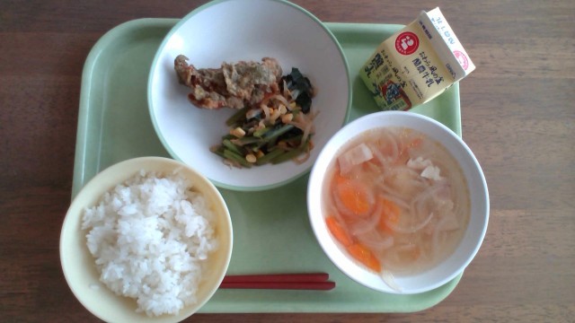 【本日の献立】 ホキの竜田揚げ チンゲンサイのひたし 厚揚げのそぼろ煮 大豆ふりかけ RICE MILK