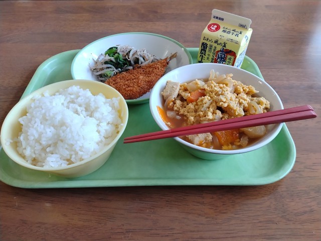 【本日の献立】 あじフライ ゆかり和え 卵とじ RICE MILK