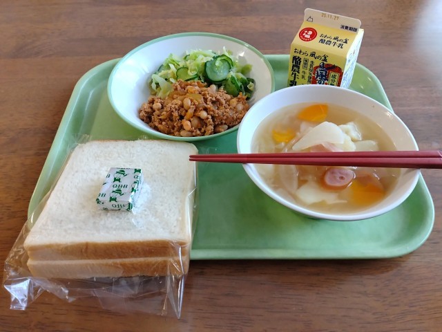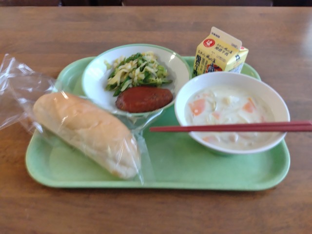 野菜サラダにアスパラガスが沢山入っていました。サクッとした食感が大好きです。我が家の食卓では最近見ない故、やはり給食はありがたいですね。