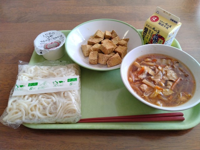【学校給食とやまの日】 さつまいものきなことくわの葉がらめ ソフト麺のとやまの五目あん りんごヨーグルト 牛乳