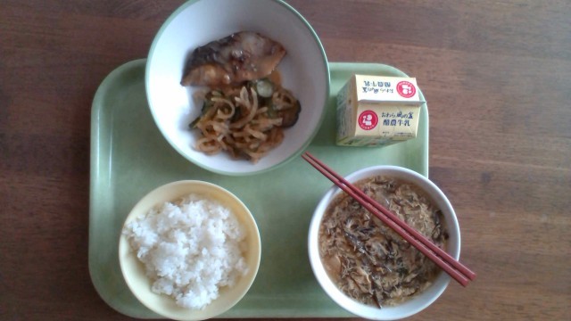 【とやまの日献立】 ふくらぎのかば焼き とろろ昆布和え ミニトマト とやまの野菜たっぷりみそ汁 ごはん 牛乳
