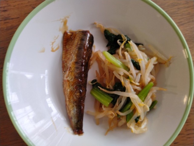 【本日の献立】 いわしの梅煮 もやしのおひたし ごまけんちん みかん(隠れて見づらいですが) RICE MILK