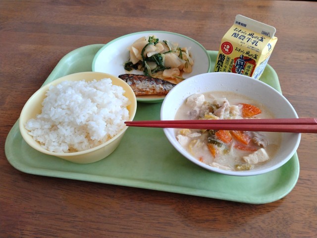 【本日の献立】 いわしの土佐煮 甘酢和え ごま豆乳鍋 RICE MILK