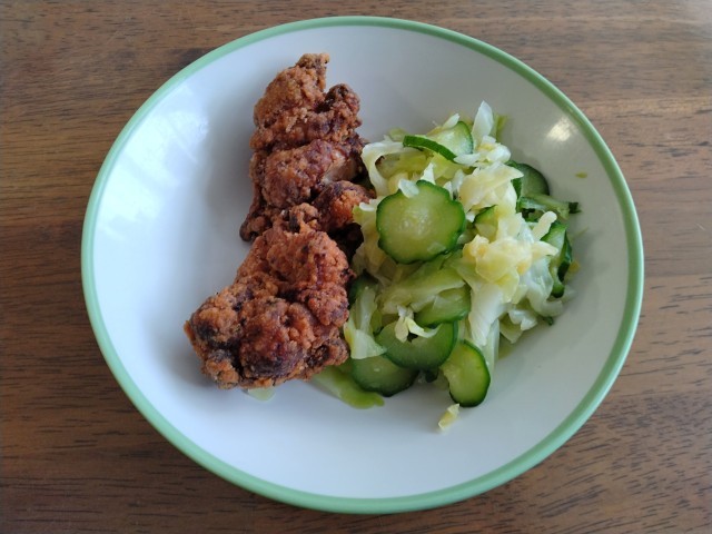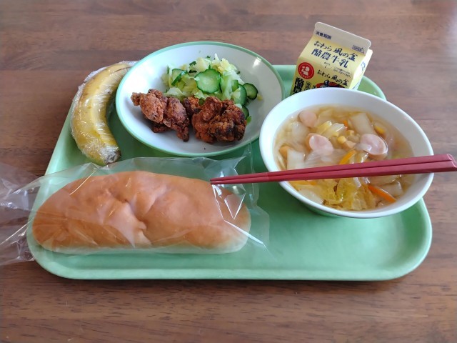 【本日の献立】 ひよこ豆のsoup chickenの塩こうじ揚げ そえ野菜(cabbage and cucumber) banana milk コッペパン(It's like a bun.)