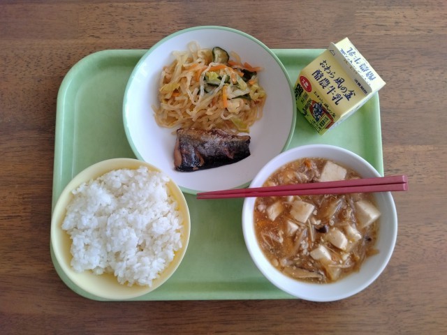 【本日の献立】 焼きぎょうざ 華風和え えびと豆腐のうま煮 RICE MILK