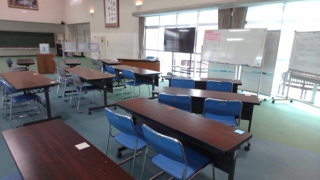 研究授業参加者の数を鑑み、午後の社会科(公民分野)の授業は多目的室(ホール)で行います。前日からの準備により、環境は整いました。