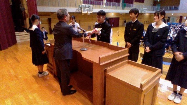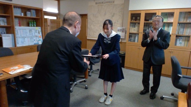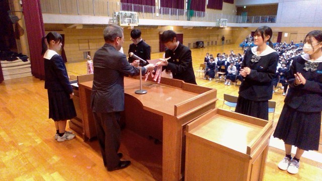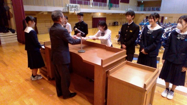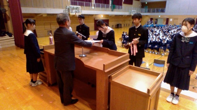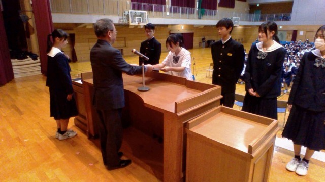 前期文化委員会企画で応募した「読売防犯川柳」で奨励賞を受賞した生徒が、校長室で賞状等を受け取りました。