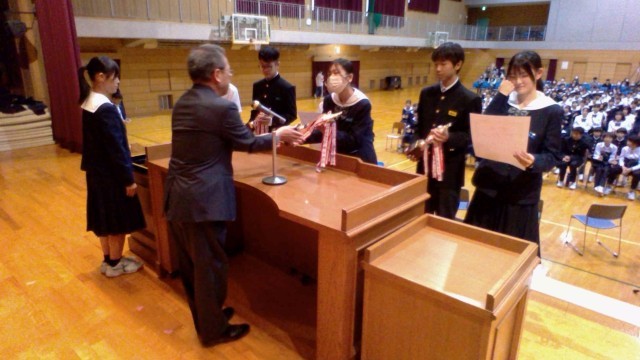各学年の優秀賞を受けた学級の代表2名が、賞状とトロフィーを受け取りました。