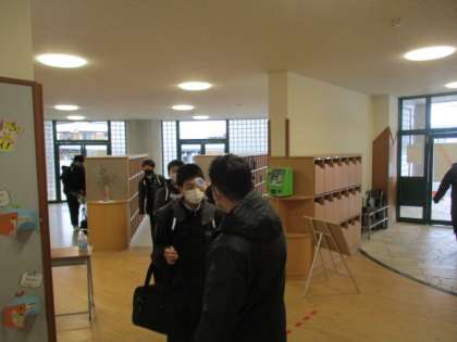 フロントガラスが凍る朝となりましたが、城中生は元気に登校しています。消毒する手がこころなしか赤いですが、手をしっかりこすって消毒と温めを同時にやっているようです。 -
