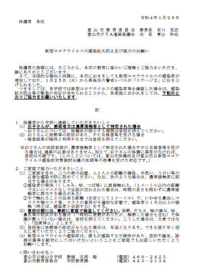 学校においては、「マスクの着用・3密を避ける・手洗いうがいの徹底」をはじめ、「不要不急の外出を避ける」「規則正しい生活を送る」ことについて改めて指導いたしました。ご家庭でも、お声掛けをお願いいたします。
