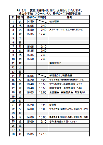 2月スクールバス予定表