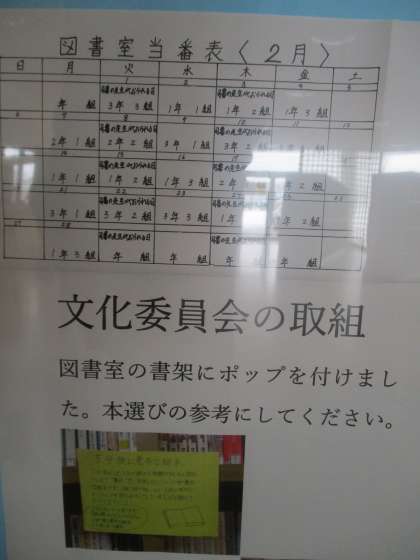 百人一首で盛り上がった1月の文化委員会の活動。2月は、通常の本の貸し出しが中心です。本日、2年の文化委員が作成した2月の図書室当番表を各クラスに掲示してもらうことにしました。少し、気が早いですが、残り少ない今年度中にたくさんの本に親しんでもらいたいと文化委員はがんばっています。
