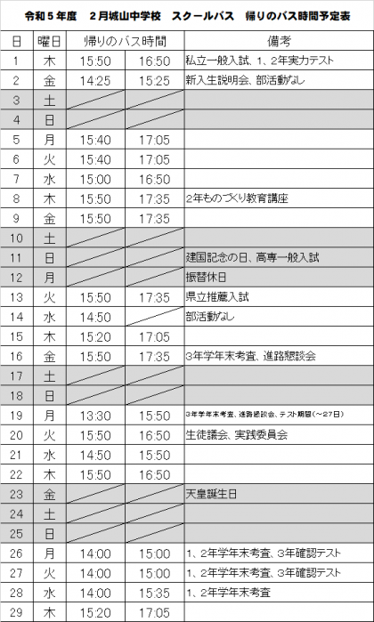 2月のバス運行予定表を掲載します。ご確認ください。変更がある場合は、ホームページにてお知らせします。