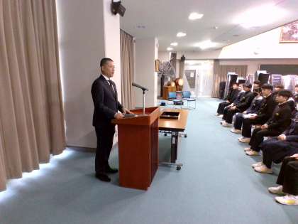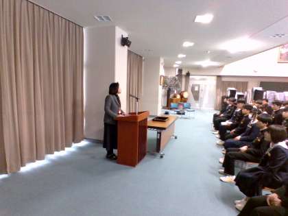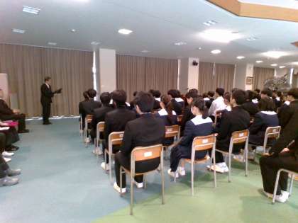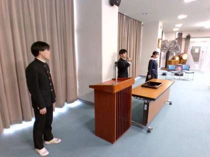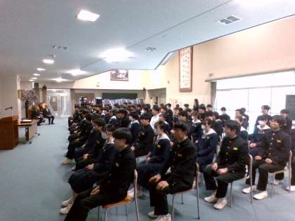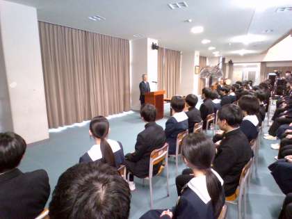 明日の入試に向けて、学年主任の先生からのお話、代表生徒から意気込みが話されました。