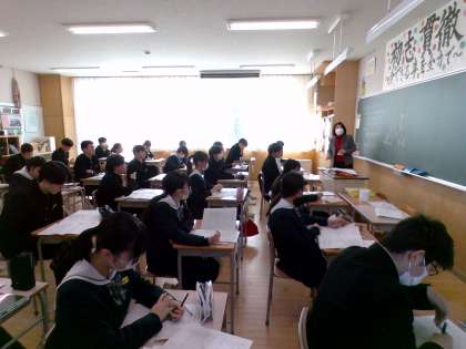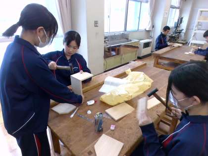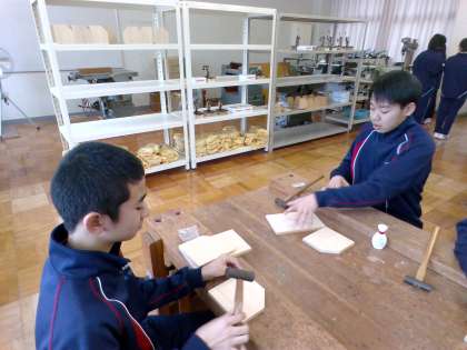 1組は国語の授業で漢字を学習していました。2組は美術で木彫を行っていました。3組は家庭科の授業でした。
