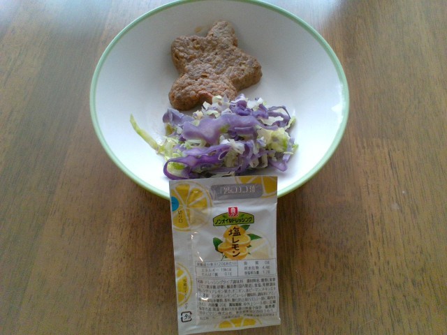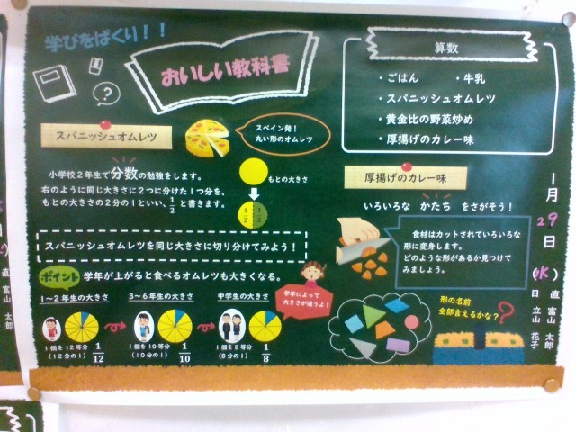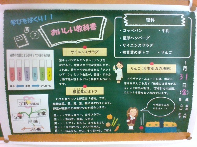 最終日の「学びをぱくり」は理科です。掲示の内容、勉強になります。ドレッシングを全部かけた紫キャベツのサラダは、変色する前に食べてしまいました。