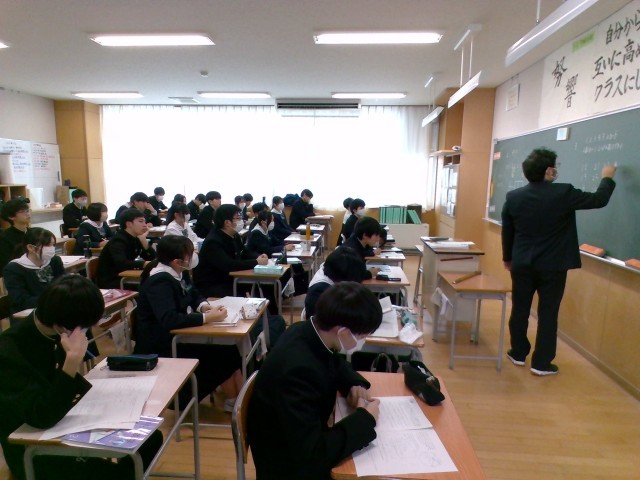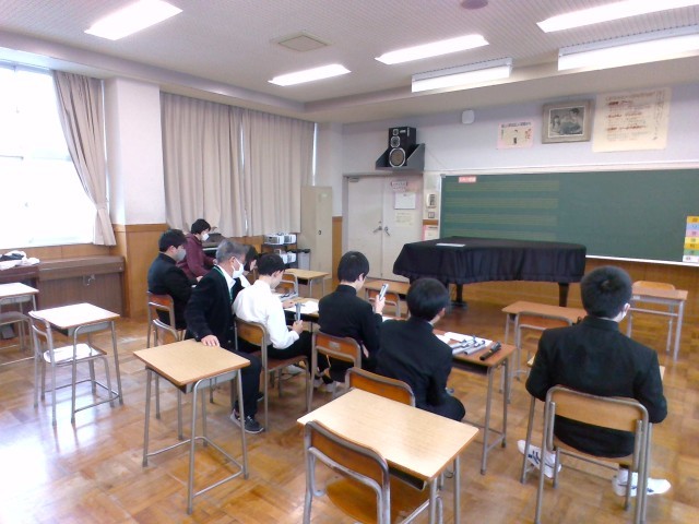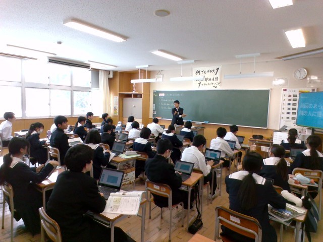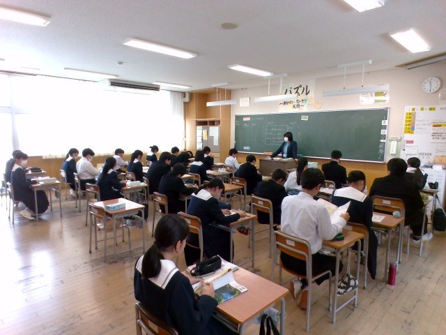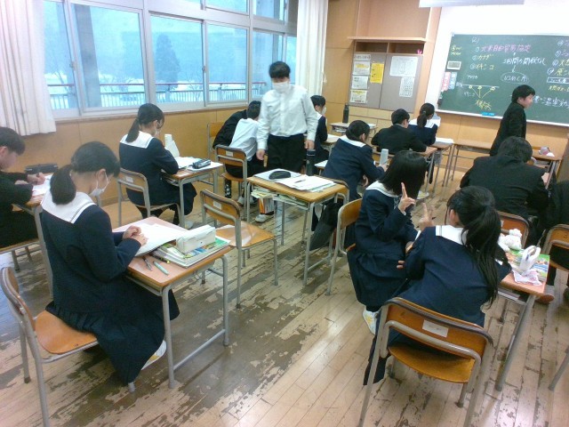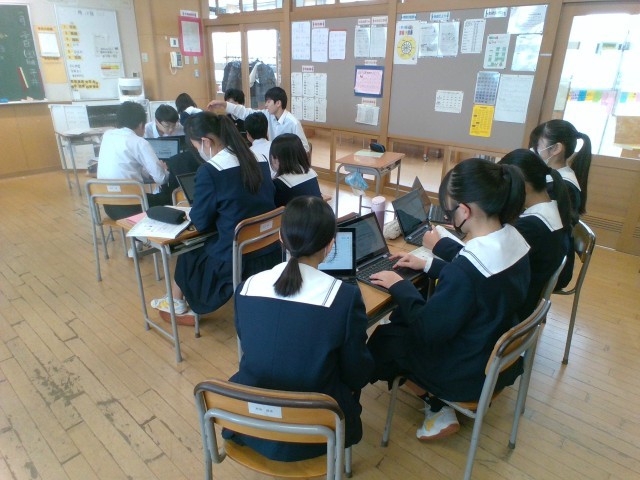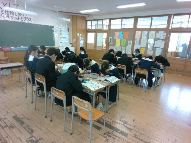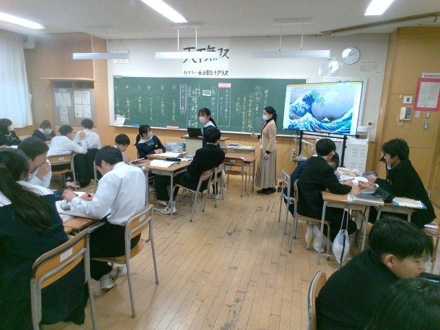 3組は国語。各班、北斎の絵を見て思案中。適切に批評する言葉、表現が脳内に浮かんできたか。