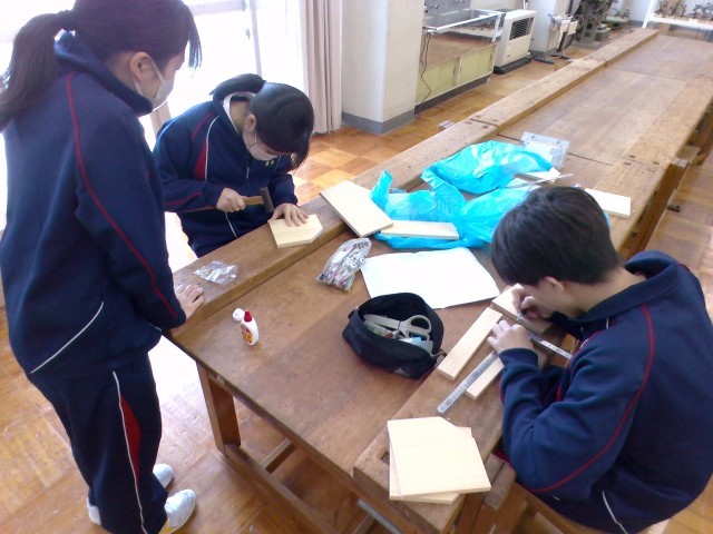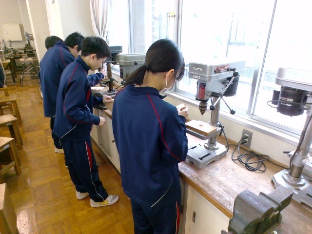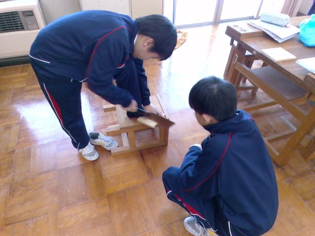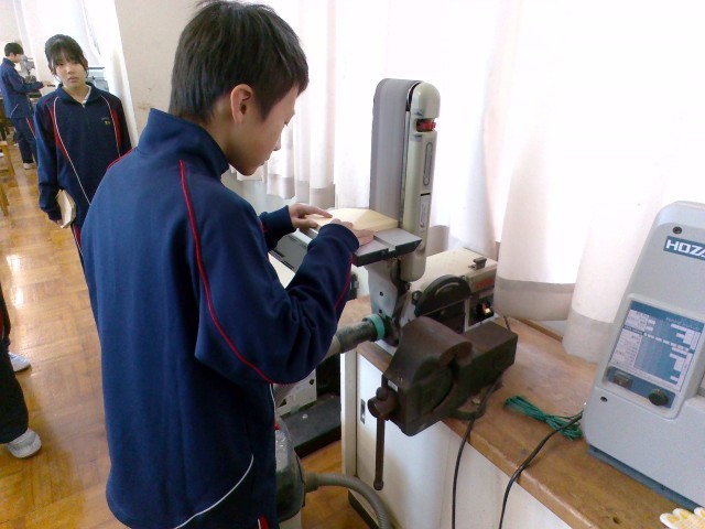 のこぎり挽き、ベルトサンダーでの削り、穴あけのためのけがきの作業をしています。