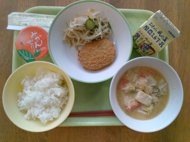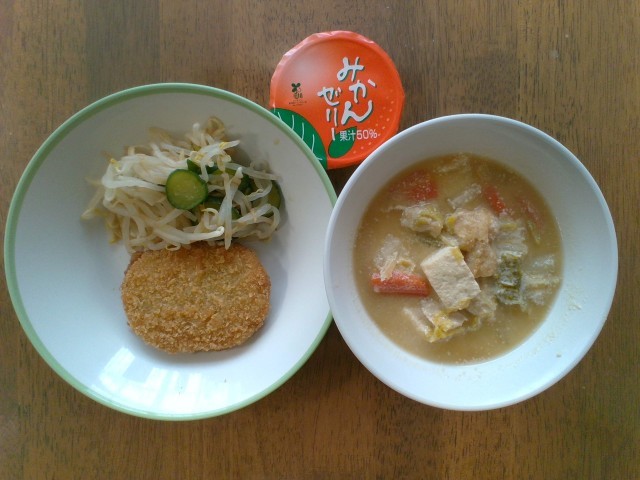 【本日の献立 給食週間4日目】 かぼちゃコロッケ 甘酢和え 大豆の変身汁 みかんゼリー ごはん 牛乳