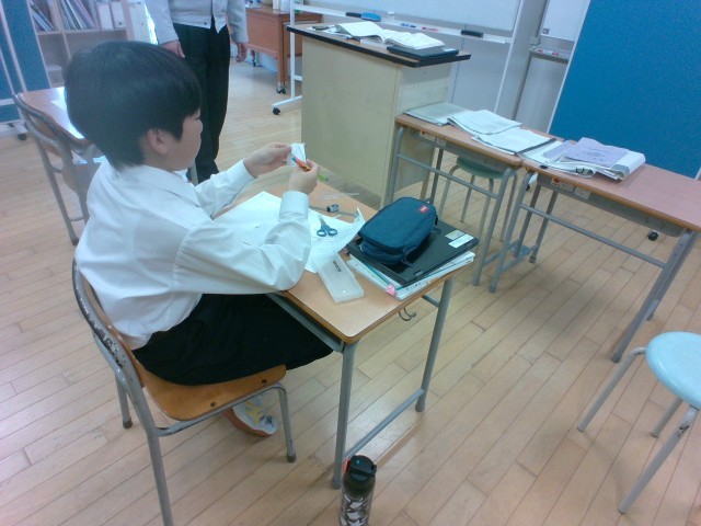 写真左2組では、立体の展開図について学習中。実際ペーパーを手に取って、作ってみたり、開いてみたり。これぞ、実感を伴う学び。