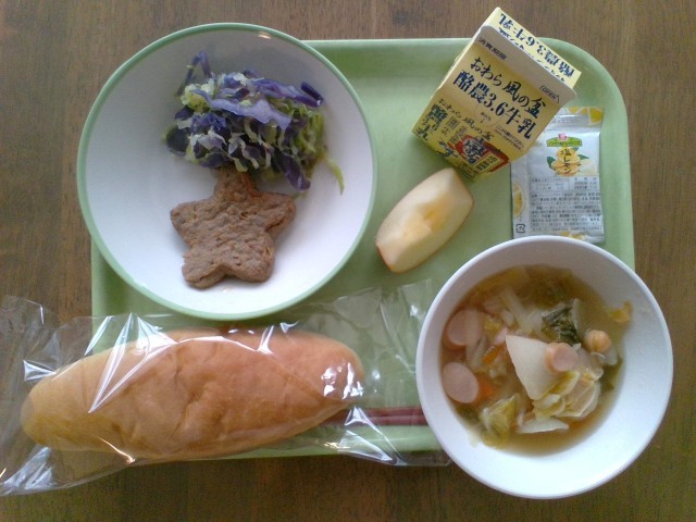 【給食週間最終日の献立】 星形ハンバーグ サイエンスサラダ 根茎葉のポトフ りんご コッペパン 牛乳