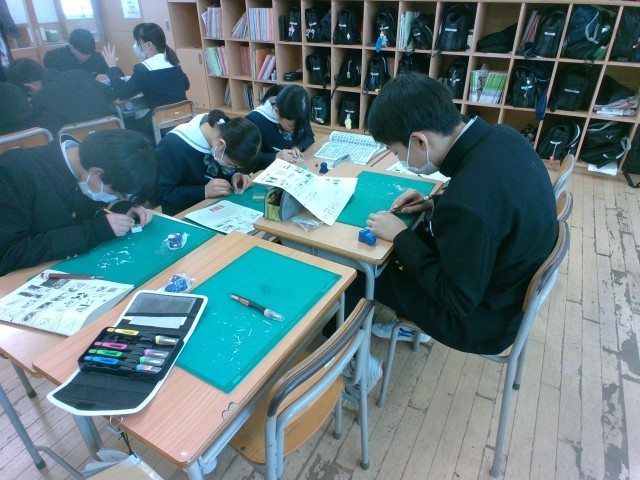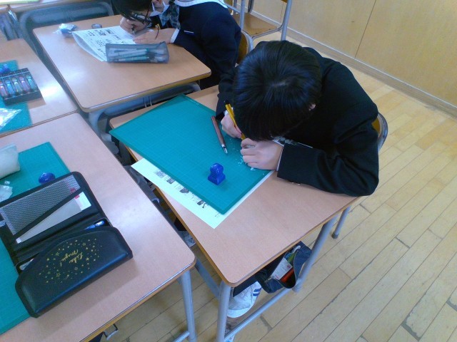 篆(てん)刻。自分の名前の一字を彫っている生徒が多いように見受けられました。まずは、ケガしないように。