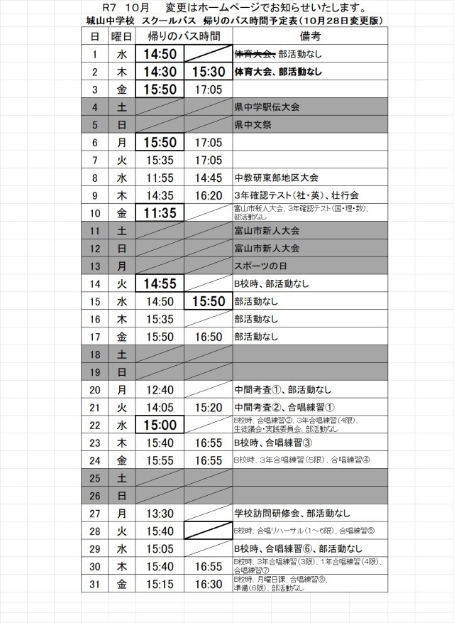 10月28日(火) スクールバス運行予定の変更