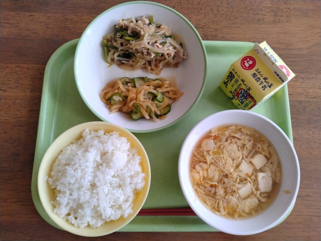 【昨日の献立】 プルコギ 華風和え 中華かきたま汁 ごはん 牛乳